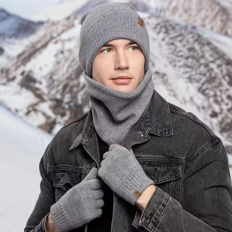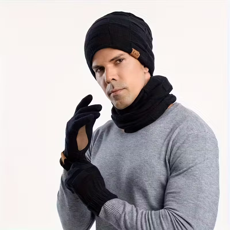 A refined winter set combining understated style with essential warmth. This three-piece ensemble includes a hat, scarf, and gloves — designed for daily wear with a minimalist edge.